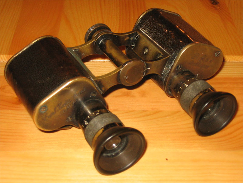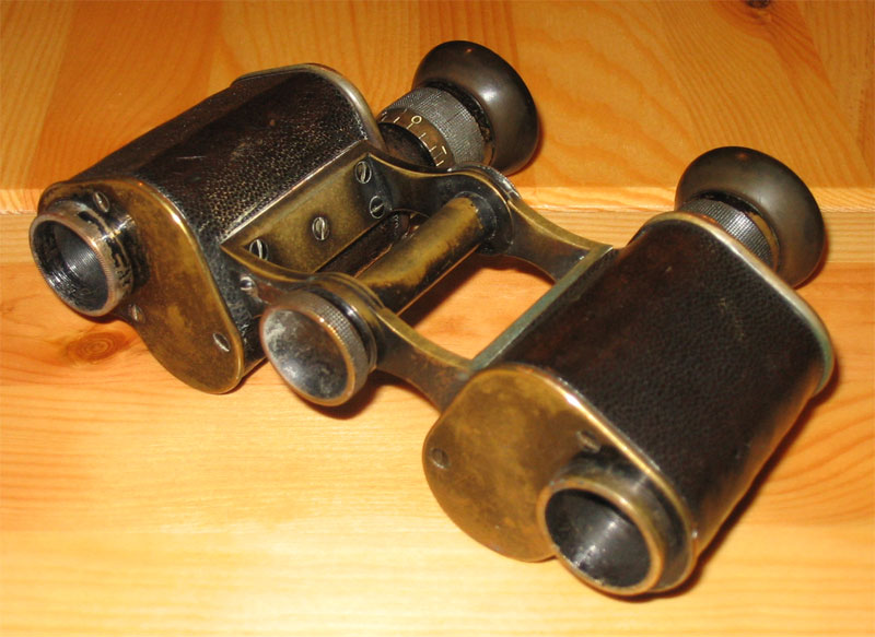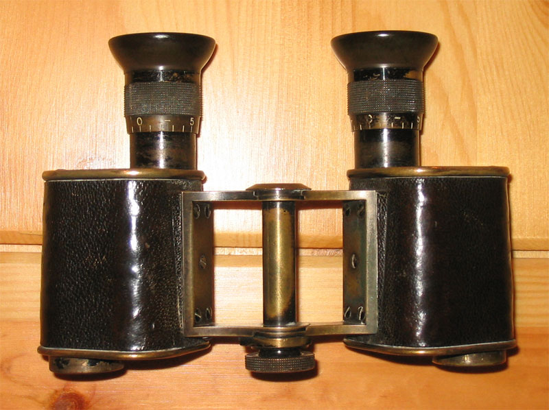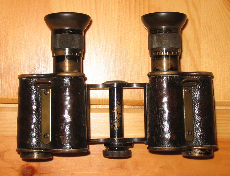 Die angeschraubte Knickbrücke, die angeschraubten Ösen für den Trageriemen, die flachen Gehäusedeckel aus Messing und die Beschriftung in Schreibschrift zeigen uns, dass es sich hierbei um ein Zeiss Fernglas aus den ersten Produktionsjahren handeln muss. Leider sind die Messingteile, die ursprünglich schwarz lackiert waren, weitestgehend blankpoliert. Ansonsten befindet sich dieses Fernglas technisch und optisch in einem überraschend guten Zustand. Dass es sich bei diesem Glas um ein Militär-Fernglas handelt, beweisen die Einzelfokussierung und die grosse Feststellschraube, mit der die Knickbrücke dauerhaft auf den eigenen Augenabstand fixiert werden kann. Die Bezeichnung "D.F." bedeutet "Doppelfernrohr" bzw. "Offiziers Doppelfernrohr". Auch dies belegt die militärische Verwendung. |